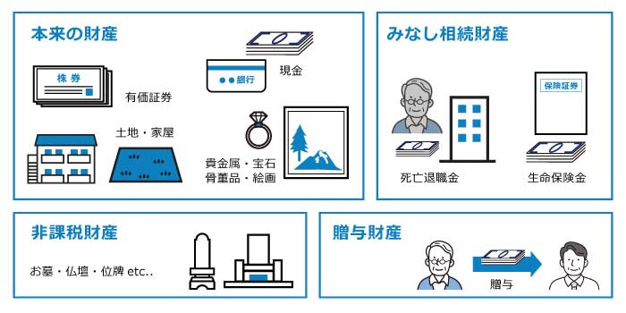 さらに、被相続人の死亡によって受け取る生命保険金や死亡退職金などは「みなし相続財産」として相続税の課税対象になる場合があります。