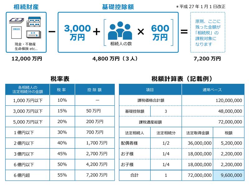 例えば、法定相続人が配偶者と子ども2人の合計3人であれば、基礎控除額は 3,000万円+(600万円×3人)=4,800万円となります。